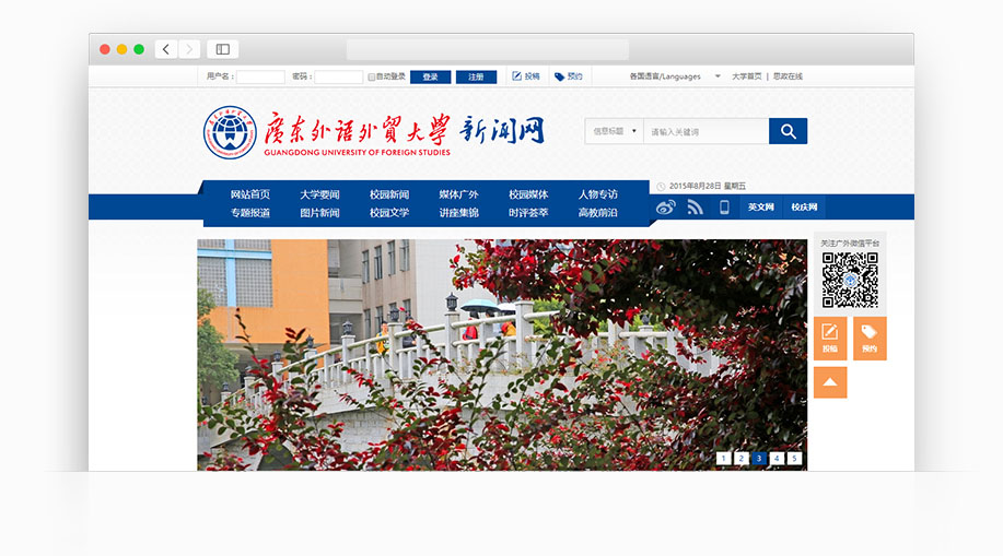廣東外語(yǔ)外貿(mào)大學(xué)英文網(wǎng)為全校同學(xué)提供了英文新聞的閱讀平臺(tái),也是國(guó)內(nèi)外交流單位、外教、留學(xué)生了解廣外的重要窗口。