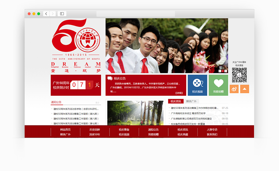 2015年11月7日,廣東外語(yǔ)外貿(mào)大學(xué)將迎來(lái)50周韶華誕。廣東外語(yǔ)外貿(mào)大學(xué)建校50周年校慶網(wǎng)(http://gw50.gdufs.edu.cn/)?是廣東外語(yǔ)外貿(mào)大學(xué)建校50周年校慶專(zhuān)題網(wǎng)站。網(wǎng)站使用統(tǒng)一的信息架構(gòu),為信息資源與使用用戶(hù)搭建一座暢通的橋梁,不僅能高效發(fā)布校慶信息,回顧學(xué)校辦學(xué)歷程,展示發(fā)展成果,構(gòu)筑學(xué)校濃厚的歷史文化,還可以輕松共享教育資源信息,為學(xué)校信息化教育增添了新的手段。前臺(tái)頁(yè)面設(shè)計(jì)針對(duì)校慶主題提供了多個(gè)欄目用于慶祝校慶,發(fā)布校慶信息,方便校友交流互動(dòng),外建校五十周年校慶網(wǎng)站“廣外50年”以鮮艷的紅色為主色調(diào),搭配清新明亮的藍(lán)、綠、黃等顏色,網(wǎng)站圖文并茂、動(dòng)靜結(jié)合,營(yíng)造一種青春洋溢、歡快喜慶的氛圍。網(wǎng)站各個(gè)版塊和欄目經(jīng)過(guò)精心的考量和設(shè)計(jì),共設(shè)有歷史回眸、校慶籌備、通知公告、校慶資訊、人物專(zhuān)訪(fǎng)、媒體廣外、深度50年、校慶視頻、我要捐贈(zèng)、校慶典藏等10個(gè)欄目,此外,前臺(tái)還提供了校慶倒計(jì)時(shí)功能。通過(guò)校慶專(zhuān)題網(wǎng)站