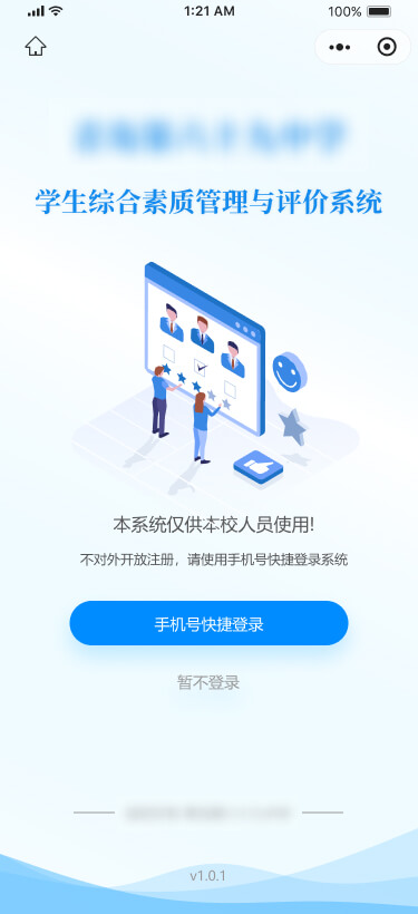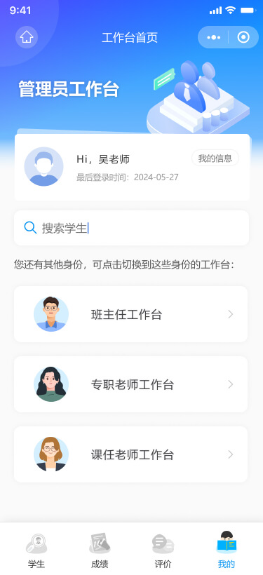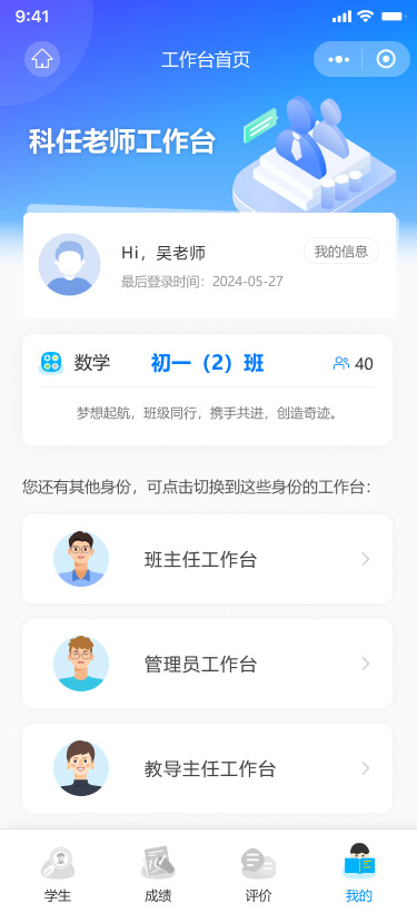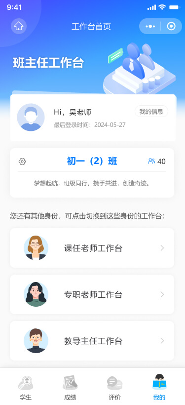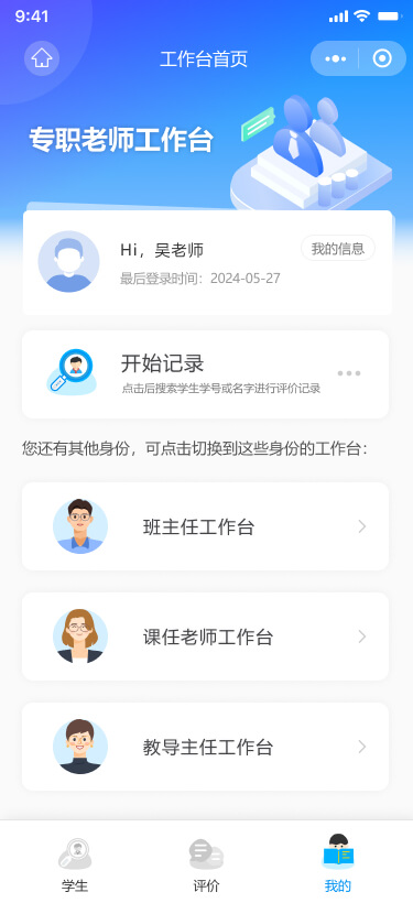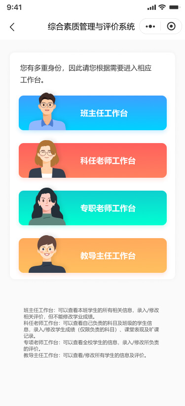 用戶通過掃描二維碼或在微信中搜索小程序,進(jìn)入學(xué)生綜合素質(zhì)管理與評價系統(tǒng)。微信授權(quán)并使用手機(jī)號登錄后,系統(tǒng)根據(jù)用戶身份(老師、學(xué)生、家長)和角色(如班主任、科任老師等)自動引導(dǎo)至相應(yīng)的工作臺。對于身兼多職的老師,系統(tǒng)提供多個工作臺供選擇。