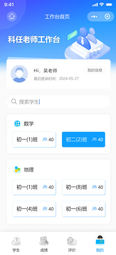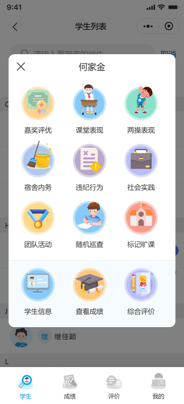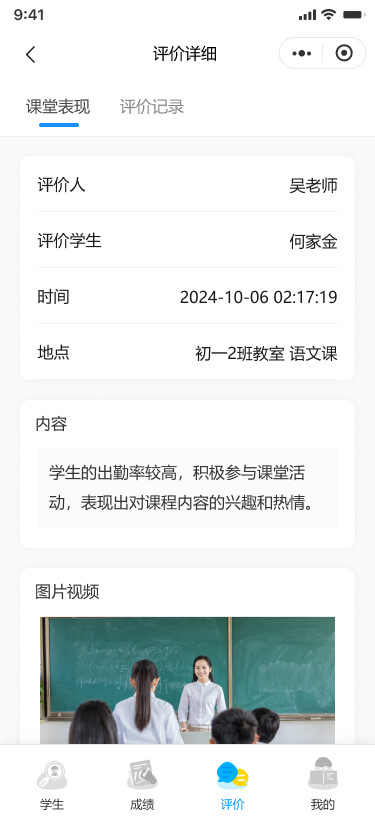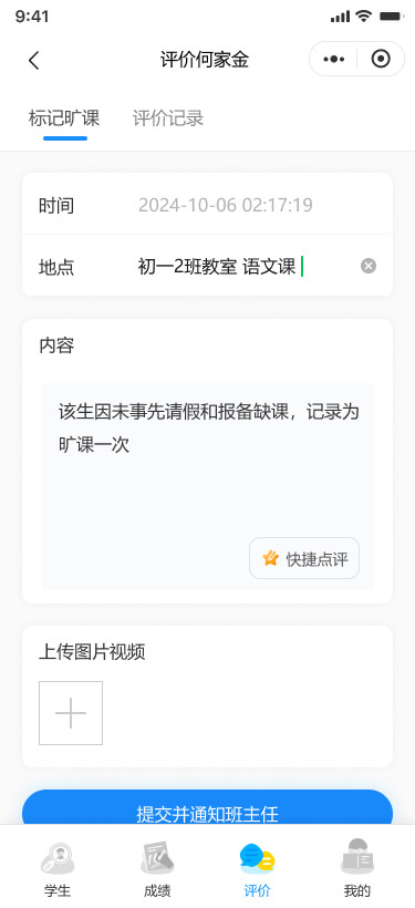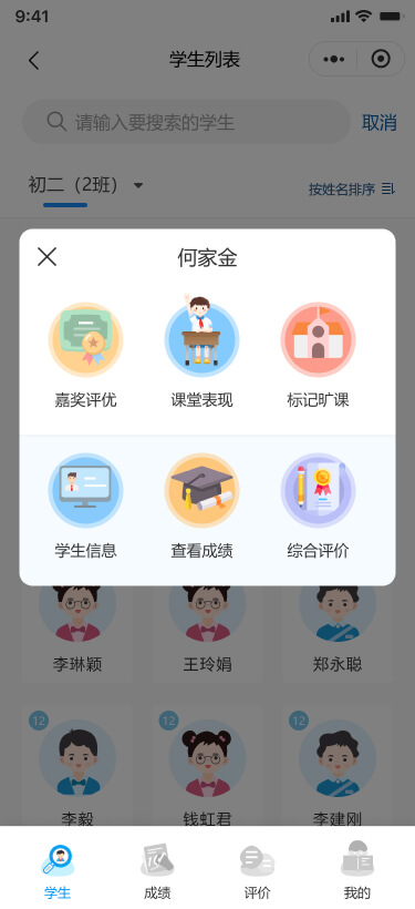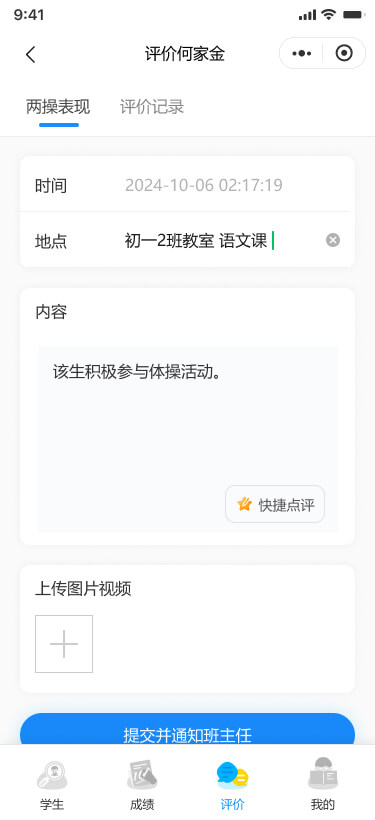 可以錄入/查看學(xué)生的“嘉獎評優(yōu)、課堂表現(xiàn)、標(biāo)記曠課”等評價記錄,支持查看學(xué)生的基本信息、成績和綜合評價。
