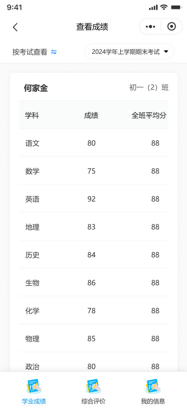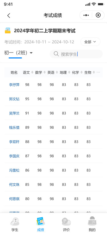 支持查看指定考試的本班學(xué)生的考試成績,查看成績時支持查看全部科目或指定科目(含總分、平均分)的成績、班級排名、年級排名。