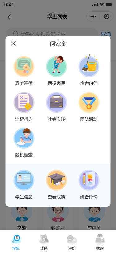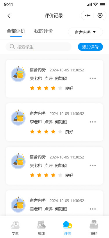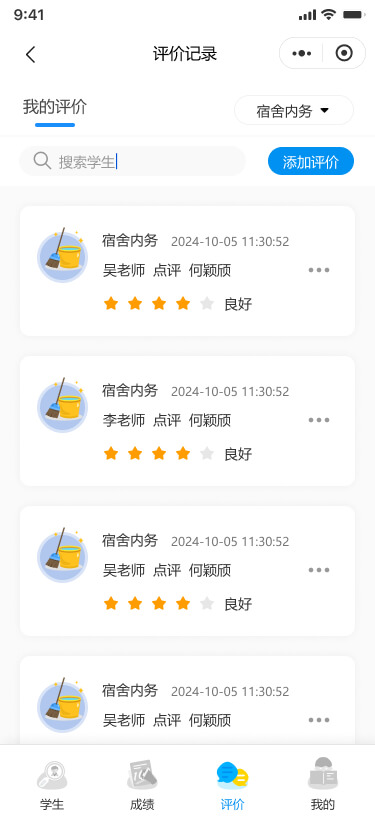 支持通過學(xué)生姓名或?qū)W號搜索學(xué)生,進(jìn)行錄入/查看各類評價記錄(如嘉獎評優(yōu)、兩操表現(xiàn)、宿舍內(nèi)務(wù)等),同時可以查看學(xué)生的基本信息、成績和綜合評價。
