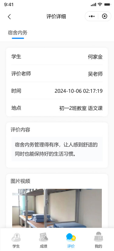 支持對學(xué)生進(jìn)行“嘉獎評優(yōu)、課堂表現(xiàn)、兩操表現(xiàn)、宿舍內(nèi)務(wù)、違紀(jì)行為、社會實(shí)踐、團(tuán)隊(duì)活動、隨機(jī)巡查、標(biāo)記曠課”等評價記錄的錄入和查看,支持查看學(xué)生基本信息、查看成績、查看綜合評價。