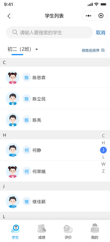 支支持按姓名排序、按學(xué)號排序,并在姓名排序時提供字母快速跳轉(zhuǎn)功能。支持搜索學(xué)生。