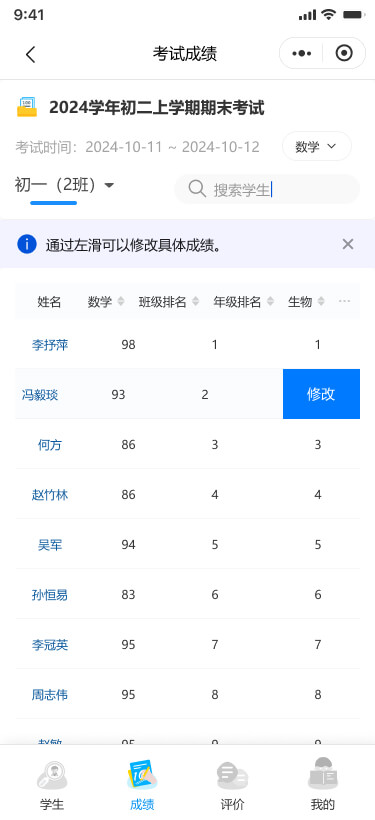 支持查看指定考試的本班學(xué)生的任教科目的考試成績、班級排名、年級排名。對于未鎖定成績的考試,可以修改某個學(xué)生的科目成績。