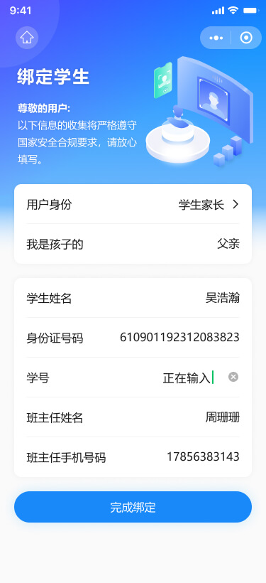 學(xué)生及家長登錄后,需先綁定學(xué)生信息。綁定時需輸入學(xué)生姓名、身份證號、學(xué)號、班主任姓名、班主任手機(jī)號等信息,確保準(zhǔn)確性。一個學(xué)生最多支持綁定4個用戶賬號,需指定與學(xué)生的關(guān)系和家長身份用于通信稱呼。