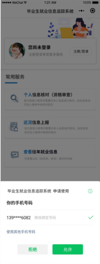 學(xué)?;虬嘀魅卫梦⑿湃旱榷喾N渠道發(fā)布填報(bào)通知,畢業(yè)生接獲通知后,通過(guò)掃描通知中二維碼快速進(jìn)入小程序。小程序自動(dòng)申請(qǐng)獲取當(dāng)前微信賬戶關(guān)聯(lián)的手機(jī)號(hào)信息,并與畢業(yè)生數(shù)據(jù)庫(kù)進(jìn)行精準(zhǔn)匹配: