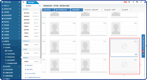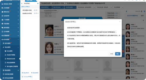 提供座位調(diào)整、自動(dòng)分派考生座位、手動(dòng)分派考生、確認(rèn)座位安排、導(dǎo)出座位表(監(jiān)考老師用)、導(dǎo)出座位表(張貼用)、導(dǎo)出簽到表功能。以及為所有考場自動(dòng)分派考生、確認(rèn)所有考場的座位安排、導(dǎo)出所有考場的座位表(監(jiān)考老師用)、導(dǎo)出所有考場的座位表(張貼用)、導(dǎo)出所有考場的簽到表操作。