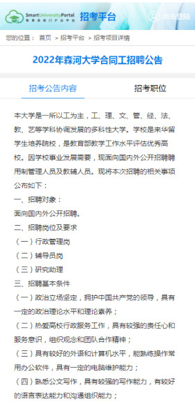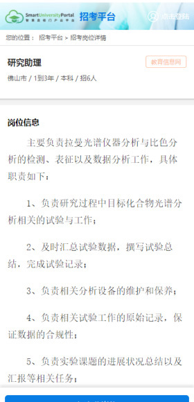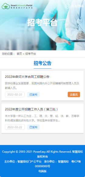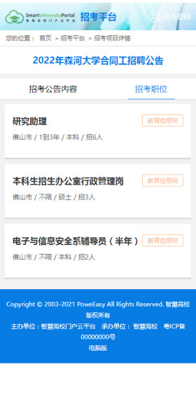 前臺支持顯示招考項目列表,用戶可以點(diǎn)擊項目名稱查看詳細(xì)信息,并在項目詳情頁中查看相關(guān)的招聘崗位列表。點(diǎn)擊崗位名稱后,可查看該崗位的詳細(xì)信息。