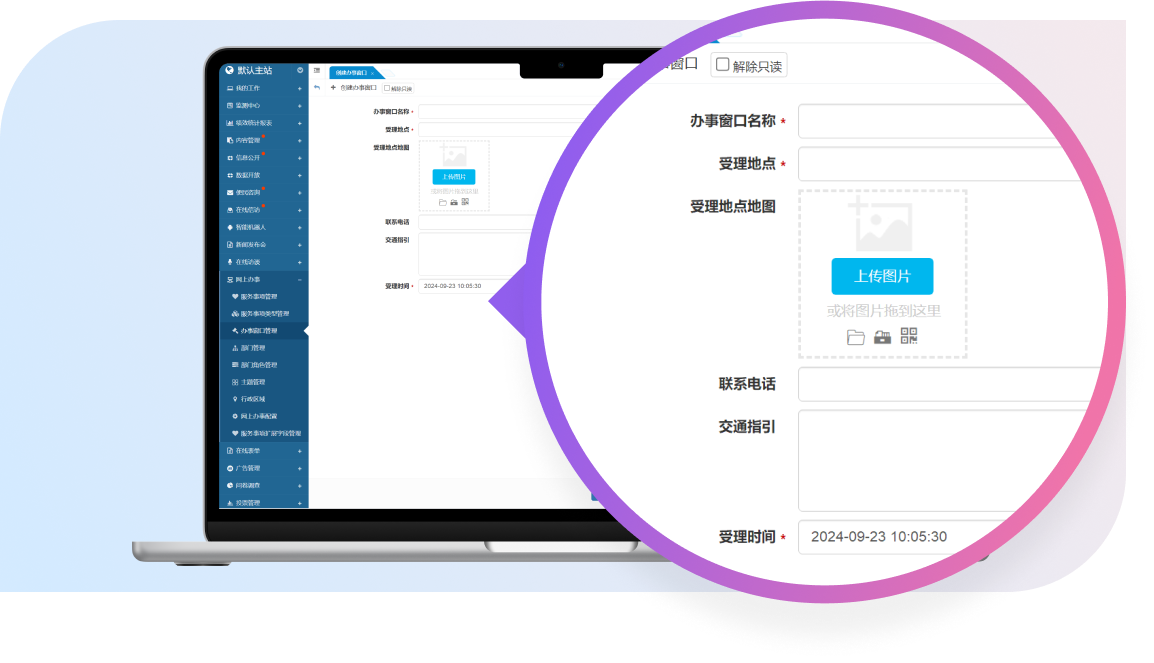 支持創(chuàng)建新辦事窗口、對現(xiàn)有辦事窗口進(jìn)行修改、查看、刪除、以及搜索與篩選功能,確保管理人員能夠輕松應(yīng)對窗口管理的各項(xiàng)任務(wù)。