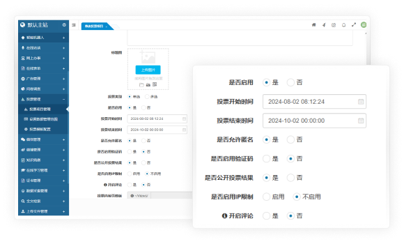 支持設(shè)定投票項目的報名開始與結(jié)束時間、投票開始與結(jié)束時間、是否公開投票結(jié)果、是否允許匿名投票、是否啟用驗證碼、是否啟用IP限制和是否啟用評論等功能。