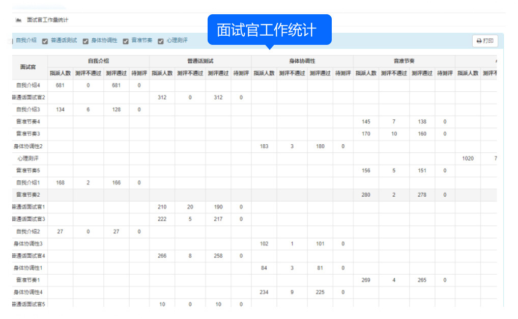 支持招生負(fù)責(zé)人在評委工作量統(tǒng)計(jì)頁面查看每個(gè)測評項(xiàng)目中的“已指派、測評不通過、測評通過、待測評”人數(shù),以及每個(gè)評委所負(fù)責(zé)的測評項(xiàng)目的工作量情況。若發(fā)現(xiàn)某評委長時(shí)間存在“待測評”的考生,系統(tǒng)可提醒評委及時(shí)完成測評,確保流程順利進(jìn)行。