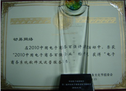 2010年9月15-17日,由中國電子商務協(xié)會和杭州余杭區(qū)政府主辦的“第二屆中國電子商務文化節(jié)暨2010中國電子商務百強峰會”盛大開幕,會上揭曉了我國首個電子商務百強榜。動易軟件作為國內(nèi)優(yōu)秀的一體化電子商務網(wǎng)站及網(wǎng)站系統(tǒng)整合解決方案提供商,與阿里巴巴、當當、卓越、李寧、京東等知名企業(yè)一道成功入選電子商務百強企業(yè),并榮膺“電子商務系統(tǒng)軟件及運營服務獎十強”獎項!