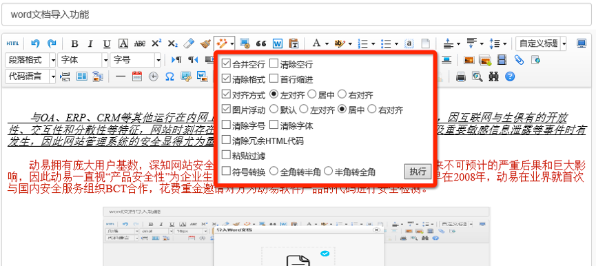 全新架構(gòu)的動(dòng)易SiteAzure 支持在線導(dǎo)入 Word 文檔,系統(tǒng)將自動(dòng)對(duì)文檔內(nèi)容、字體格式、排版進(jìn)行識(shí)別并保留 Word 文檔樣式,可在內(nèi)容編輯器中可視化展示;同時(shí),Word 文檔中的圖片、表格等文件將自動(dòng)上傳直接顯示在編輯器里,用戶可以在編輯器中繼續(xù)編輯或排版,也可以無(wú)需編輯排版而直接發(fā)布。發(fā)布的文章在網(wǎng)站前臺(tái)展示的效果和 Word 文檔中的效果一致。