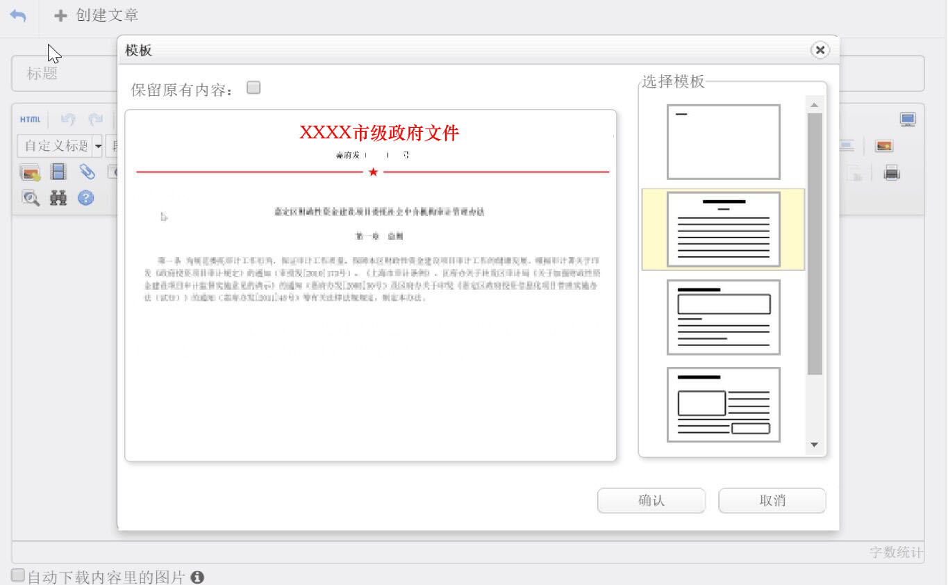 政府紅頭文件擁有指定的格式標(biāo)準(zhǔn)和要求,目前絕大部分紅頭文件的編輯都需要編輯者進(jìn)行二次編輯。全新架構(gòu)的動(dòng)易SiteAzure 將提升編輯效率做到極致,為客戶提供“一鍵格式化為紅頭文件”功能。支持將編輯器內(nèi)的文字內(nèi)容,使用“紅頭文件”模板,一鍵將內(nèi)容格式化為紅頭文件的指定格式。