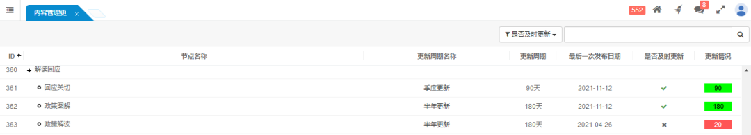 系統(tǒng)提供了監(jiān)測中心及績效統(tǒng)計報表功能,可以對政策文件\政策解讀的發(fā)布情況進(jìn)行統(tǒng)計、對更新情況進(jìn)行日常監(jiān)測。此外,系統(tǒng)還提供內(nèi)容更新預(yù)警功能,擁有權(quán)限的管理員可以收到信息提醒通知。