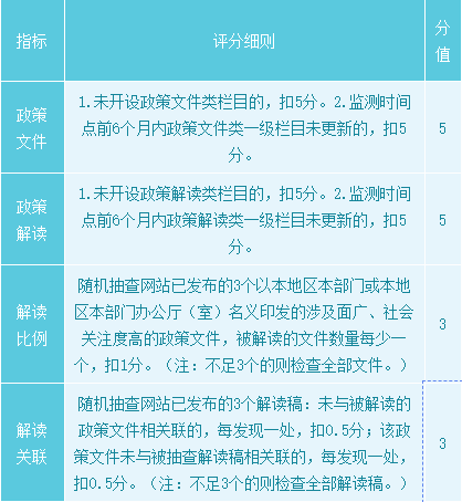 政策解讀是政府網(wǎng)站績效考核的一個重要部分,涉及考核分值16分(政策文件+政策解讀+解讀比例+解讀關(guān)聯(lián))。關(guān)于政策解讀的主要內(nèi)容, 在2019年4月1日 《國務(wù)院辦公廳秘書局關(guān)于印發(fā)政府網(wǎng)站與政務(wù)新媒體檢查指標(biāo)、監(jiān)管工作年度考核指標(biāo)的通知》可以看到:
