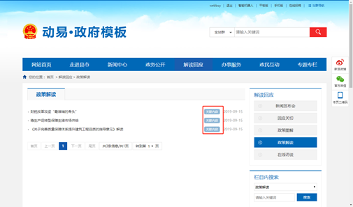 解讀材料上應(yīng)隨政策文件同步在政府網(wǎng)站予以公開發(fā)布。在動易系統(tǒng)中,管理員發(fā)布政策解讀時,可將解讀材料和被解讀的政策文件相互關(guān)聯(lián)。