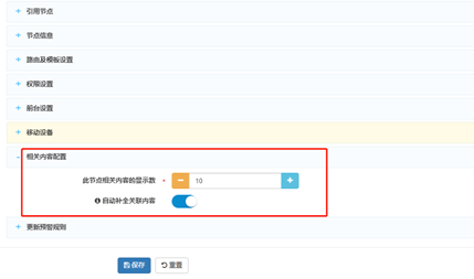 系統(tǒng)提供了“相關(guān)內(nèi)容補(bǔ)全”功能。開啟這個功能后,當(dāng)手工設(shè)置的相關(guān)內(nèi)容數(shù)量達(dá)不到在此節(jié)點(diǎn)相關(guān)內(nèi)容的顯示數(shù),或沒有手工設(shè)置相關(guān)內(nèi)容時,系統(tǒng)自動通過全文檢索功能找到包含了在“關(guān)鍵詞”字段中設(shè)置的關(guān)鍵詞內(nèi)容,并填充到相關(guān)內(nèi)容列表中,以盡量保證足額顯示相關(guān)內(nèi)容。