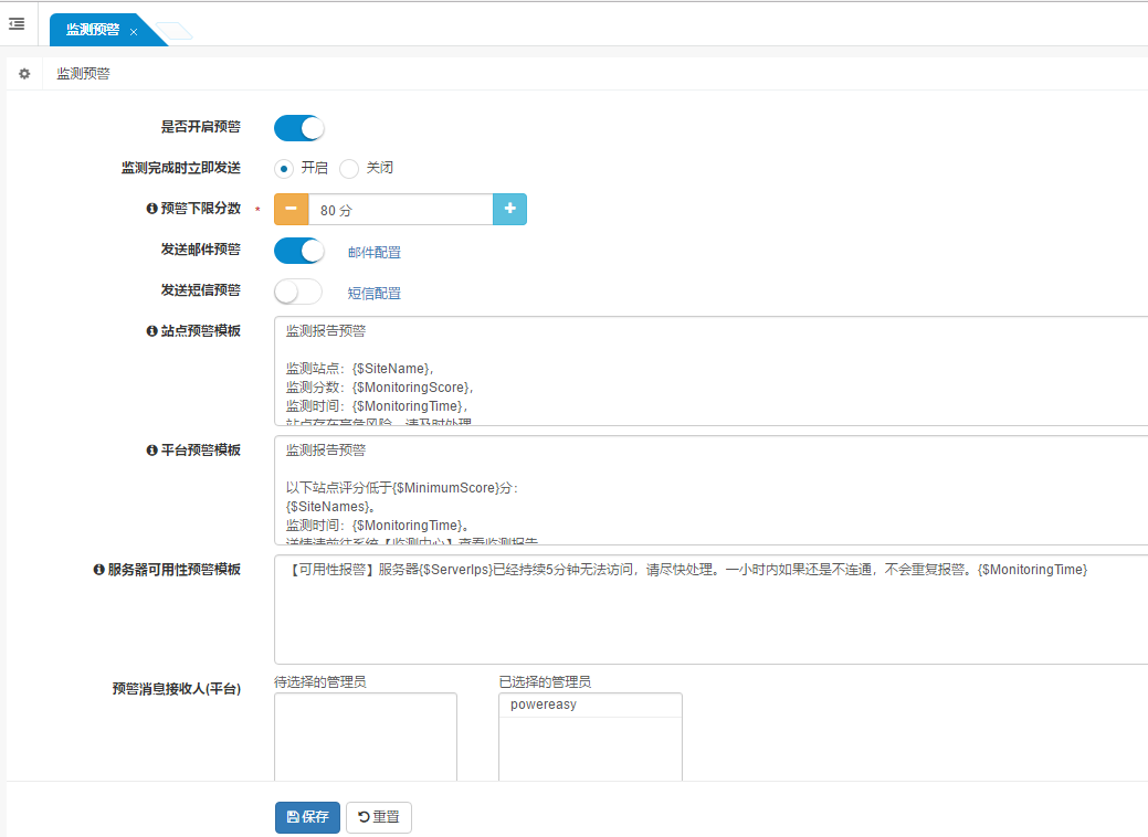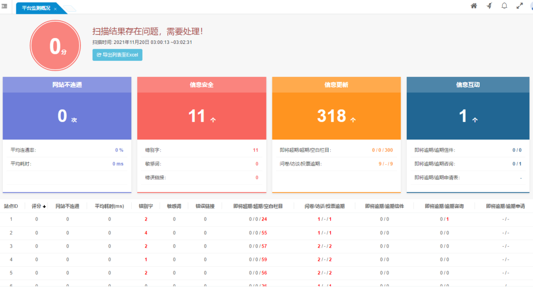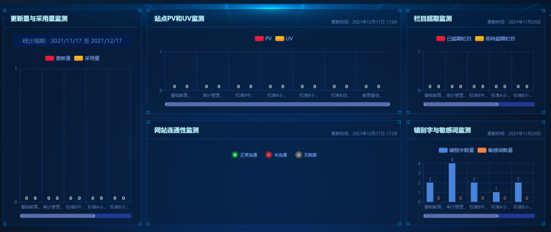 可以呈現(xiàn)網(wǎng)站群運(yùn)行和網(wǎng)站績(jī)效考核要點(diǎn)的監(jiān)測(cè)情況,包括站點(diǎn)可用性監(jiān)測(cè)、欄目更新情況監(jiān)測(cè)(含欄目更新預(yù)警、超期欄目、空白欄目)、錯(cuò)別字監(jiān)測(cè)、敏感詞監(jiān)測(cè)、錯(cuò)鏈監(jiān)測(cè)、問(wèn)卷調(diào)查監(jiān)測(cè)、投票監(jiān)測(cè)等。全面統(tǒng)計(jì)網(wǎng)站群系統(tǒng)運(yùn)行的綜合情況,實(shí)現(xiàn)以大數(shù)據(jù)分析結(jié)果為依據(jù)進(jìn)行日常的智能管理。