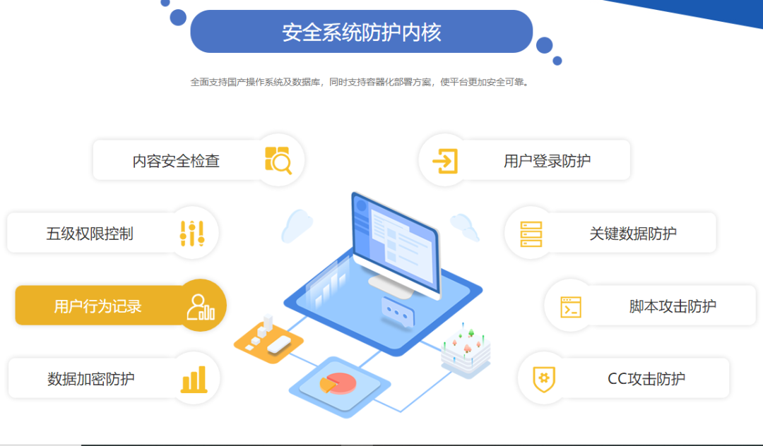 網站系統(tǒng)具備完善的安全體系防護系統(tǒng),已通過信息安全等級保護的要求,全面支持國產操作系統(tǒng)及數據庫。同時方案還集成強大的安全系統(tǒng)防護內核,保障平臺穩(wěn)定可靠運行。