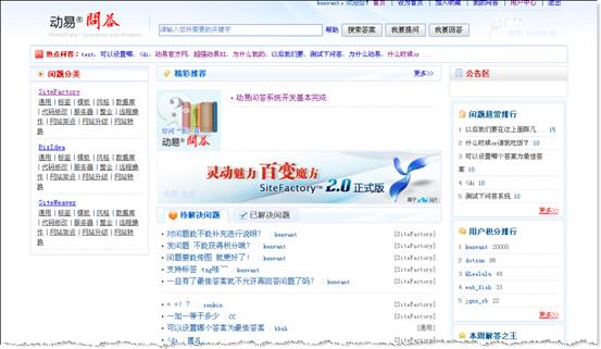 通過(guò)上圖我們可以發(fā)現(xiàn),目前動(dòng)易問(wèn)答系統(tǒng)功能已經(jīng)基本完整了。從最頂部的“會(huì)員登錄”、“我的問(wèn)答”到“我要提問(wèn)”、“我要回答”等功能均已完成;同時(shí)也已經(jīng)完成了“問(wèn)題兩級(jí)分類”、“待解決問(wèn)題”與“已解決問(wèn)題”區(qū)分,“用戶積分排名”、“本周解答之王”、“問(wèn)題懸賞排名”等我們常見的問(wèn)答功能模塊。一句話,這個(gè)預(yù)覽版已經(jīng)頗具規(guī)模!