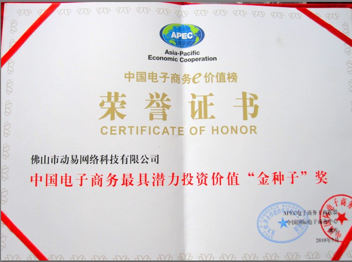 2010年5月21日,由APEC(亞太經濟合作組織)和中華人民共和國商務部在四川成都主辦的“第四屆APEC電子商務工商聯盟論壇”傳出喜訊,按照“成長性、創(chuàng)新性、影響力和經典案例”等四項評選標準,經組委會嚴謹評定,作為“全程式電子商務解決方案”的開創(chuàng)者,國內最大的網站管理系統提供商,動易公司榮膺“中國電子商務最具潛力投資價值‘金種子獎’”!。