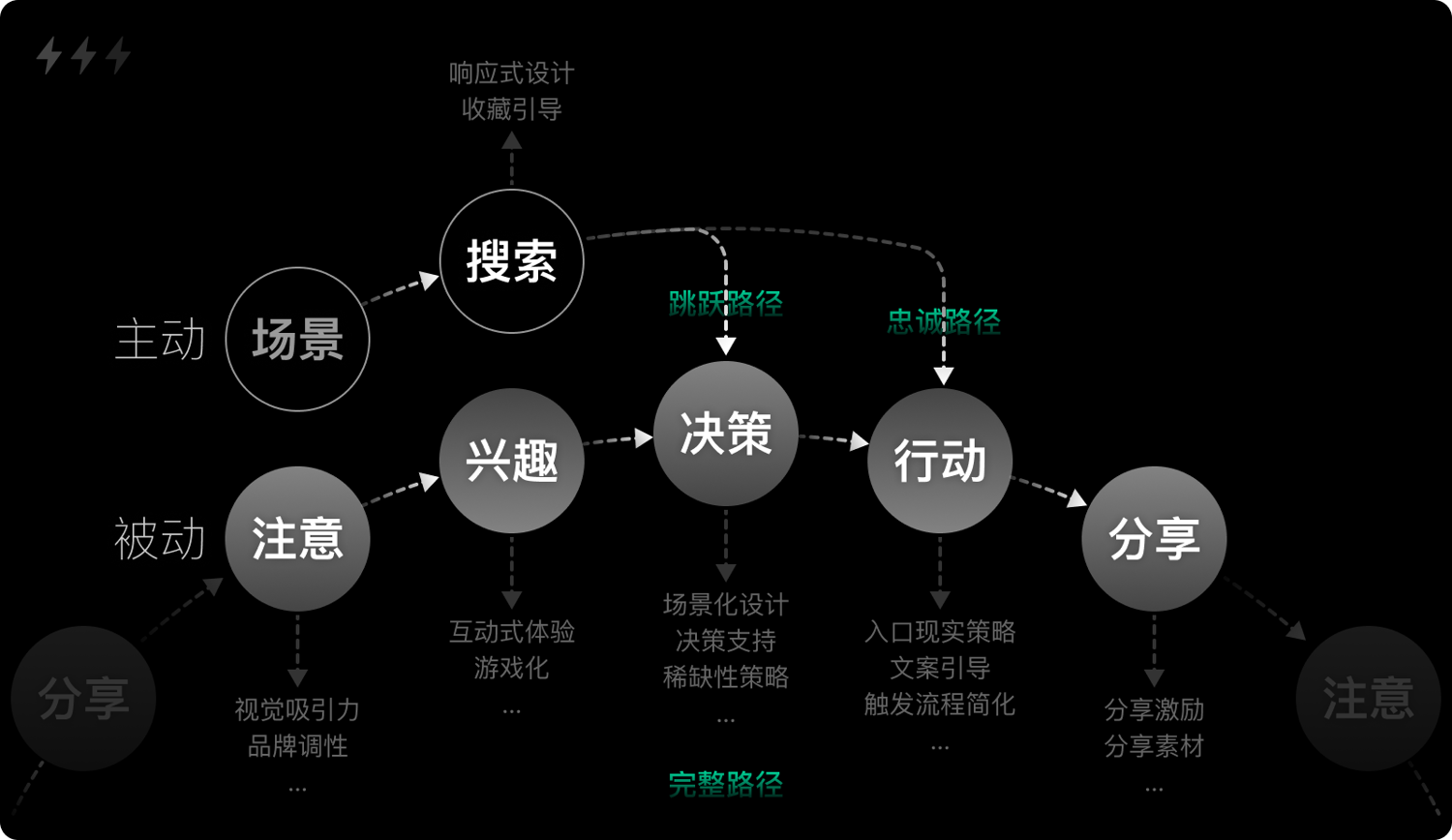 在充分借鑒多個模型的基礎上,并結合線上用戶和場景特點,梳理出一個我認為更符合數(shù)字消費者行為特點的決策模型。該模型同CDJ模型相似,采取環(huán)狀流程,以主動型和被動型兩類用戶為出發(fā)點,由“完整路徑”“跳躍路徑”“忠誠路徑”三個部分組成,包括了注意、興趣、決策、行動和分享等五個關鍵節(jié)點。