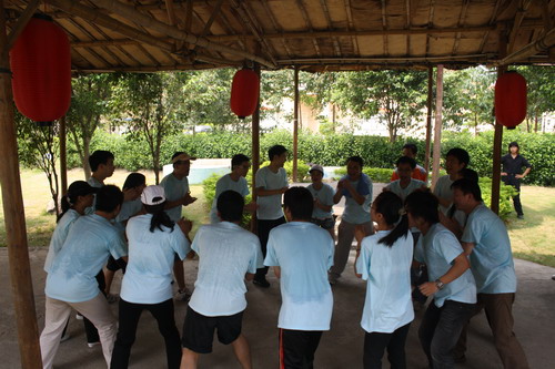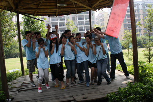 活動(dòng)的第一天9月20日是星期天,大家個(gè)個(gè)精神抖擻,很早就到了公司集合。上車后大家笑笑鬧鬧,一路飛歌,早上9點(diǎn)多就到了目的地。在換好拓展公司統(tǒng)一發(fā)放的T恤并做了幾個(gè)熱身的小活動(dòng)后,大家就開始進(jìn)入第一天活動(dòng)的準(zhǔn)備階段---建立團(tuán)隊(duì)。所有人按照?qǐng)?bào)號(hào)的順序分成了四隊(duì)后,就分組去開始討論自己的隊(duì)名、口號(hào)和隊(duì)歌。我被分到了第一隊(duì),福娃自告奮勇當(dāng)了隊(duì)長,因?yàn)榇蠹移綍r(shí)喜歡叫他雷娃,所以我們的隊(duì)名很順理成章就叫了“雷隊(duì)”,口號(hào)就是“雷!很雷!非常雷!”,之后也不知道誰的提議,隊(duì)歌就用了“妹妹你坐船頭,哥哥在岸上走,恩恩愛愛纖繩蕩悠悠……”這幾句,于是乎無比響亮的一句口號(hào)配上了相當(dāng)軟綿綿的幾句歌詞,倒也頗顯我們隊(duì)剛?cè)岵?jì)的特色。其他幾的隊(duì)隊(duì)名、風(fēng)格各異,有叫十八羅漢隊(duì)的,有叫野狼隊(duì),更有甚者叫劍人隊(duì)(此“劍”還是彼“賤”?大家可自由聯(lián)想)。我們隊(duì)的人員相當(dāng)齊心,在第一輪的展示和團(tuán)隊(duì)小游戲中就拿了第一個(gè)高分,當(dāng)然這是后話。