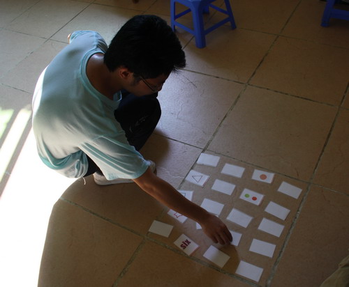 下午陽光更猛烈,在做了幾個(gè)指令聽起來簡單,結(jié)果卻讓大家亂成一團(tuán)糟的團(tuán)體小游戲之后,第一個(gè)名叫“達(dá)芬奇密碼”的拓展項(xiàng)目開始了。這個(gè)活動(dòng)規(guī)則是:每隊(duì)一名教練坐在隊(duì)伍大概四、五米開外,面前擺了20張覆蓋著的牌,每張牌的圖案都不同,每隊(duì)每次派出一個(gè)人去翻牌,如果翻對(duì)了那么可以繼續(xù)翻下一張,如果翻錯(cuò)了那么前面已翻的牌都要重新覆蓋,所以需要前一個(gè)翻牌的人記住自己翻的牌,然后傳達(dá)給下一個(gè)人。我們隊(duì)一開始商量了非常完美的策略:即每個(gè)人按順序去翻一張牌,不管翻對(duì)翻錯(cuò)都先把牌的內(nèi)容記下來,回來后報(bào)給負(fù)責(zé)記錄的同事,等把所有圖案都記下來之后,再來尋找規(guī)律,根據(jù)規(guī)律再去翻第二輪。我們幾個(gè)女孩子是負(fù)責(zé)記錄的,每個(gè)人回來后都把自己看到的圖案報(bào)給我們,有的是圓,有的是星星,有的是花瓶,有的是一對(duì)手,有的是一對(duì)腳……還有一些復(fù)雜的圖案,只能勉強(qiáng)用文案或圖案記錄下來。等到第一輪翻完再來看所有圖案找規(guī)律時(shí),卻勉強(qiáng)從1找到7之后就陷入了僵局,再也找不下去了,去翻了好幾次都是錯(cuò)的,因?yàn)槊總€(gè)人都只知道自己看到的內(nèi)容,根本無法跟其他人的聯(lián)系起來。幸好第二輪的規(guī)則有了些小小的不同,即使是翻開錯(cuò)誤的牌也不用再把前面的牌再覆蓋了,下一個(gè)人可以接著再翻另一張。于是在剩下不多的時(shí)間內(nèi)無法再講究其他什么理論上的策略,唯有比拼速度,每組都是一個(gè)接一個(gè)人快速地跑過去翻牌,這樣下去總有翻對(duì)的時(shí)候。如此一來靠著男同胞們的體力,我們隊(duì)勉勉強(qiáng)強(qiáng)在規(guī)定時(shí)間內(nèi)完成了這個(gè)游戲,但相比之下成績并不是特別好,只拿到第三名,之前落后的劍人隊(duì)反倒拿了第一名。
