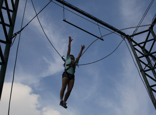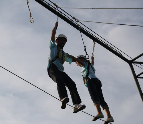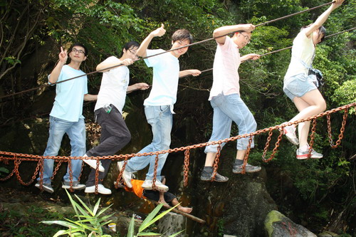 接下來的室外“個(gè)人突破高空項(xiàng)目”我覺得應(yīng)該算是當(dāng)天最刺激的一個(gè)活動(dòng)吧。我們四隊(duì)分別挑戰(zhàn)不同的高空項(xiàng)目,我們隊(duì)分配到的是“高空平衡木”,要先從旁邊的三角架往上爬,爬到大概二、三層樓高的時(shí)候走上一根平衡木,走過平衡木之后再依靠安全帶的力量從高空上“飛”下來。我們組的靚女曹倩很勇敢地第一個(gè)上了,而且很順利地走了下來。我一向有些畏高,平時(shí)上到三樓以上再往下望都會(huì)覺得頭暈,特別是看到同組的阿燕下來后眼圈都紅了,不禁更讓我打怵起來,但畏畏縮縮不是辦法,到最后也只能硬著頭皮上了。爬鐵架倒是挺輕松的,每個(gè)農(nóng)村的孩子都有爬過樹的經(jīng)歷,但站上了平衡木,第一感覺就是心慌,我背靠在三角架的柱子上不敢離開絲毫,也不敢往下看,同事們都在下面鼓勵(lì)我,大聲叫著讓我邁出第一步。我閉了閉眼睛,深呼了一口氣,邁出了自己的右腳,但手還是扶在身后不敢松開。其他組的同事在鐵架的另一邊活動(dòng),以致于平衡木晃得很厲害,我覺得自己隨時(shí)都可能摔下去,雖然知道身后掛有安全帶,但那種恐懼感卻是與生俱來的,怎么也揮不去。就這樣我站在平衡木上進(jìn)退不得,腦門上都是汗,但事已至此,似乎沒有其他選擇了,我定了定神,慢慢放開了手,開始邁出第二步。真正邁開了步子沒有了依靠心里的恐懼反而倒消失了,我三步二步就走到了平衡木的中間,終點(diǎn)就在眼前了,在最后晃悠了一下,差點(diǎn)滑下去之前我終于抓住了終點(diǎn)的鐵架,那一瞬間我繃緊的神經(jīng)終于松弛了下來,下來的時(shí)候吊著安全帶享受了象小鳥一樣的短暫飛翔,那是以前從未體驗(yàn)過的感覺。落地那一刻心情真是前所未有的輕松,再看看其他組挑戰(zhàn)的高空項(xiàng)目,發(fā)現(xiàn)我錯(cuò)過了不少精彩,相比較我們組的項(xiàng)目,其他組挑戰(zhàn)的“高空走鋼絲”和“跳出真我“更加驚險(xiǎn)及刺激,但每個(gè)人都在勇敢地挑戰(zhàn)自己的極限。雖然下來后福娃取笑我在平衡木上腿肚子一直在打顫,但我終究是走過來了,這一次,我也真正挑戰(zhàn)了我自己!