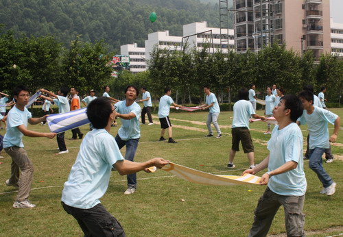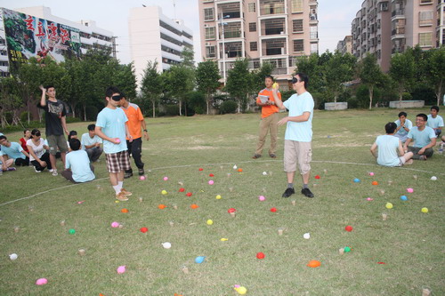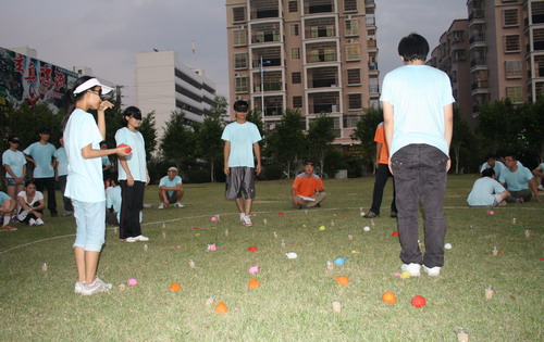 第一個(gè)正式的拓展項(xiàng)目名稱叫做“南水北調(diào)”,玩法是各組每2人站成一對(duì),每對(duì)人手上拿一塊毛巾,每組分配有30個(gè)汽球全部裝好水,將水球放到毛巾上,每次一個(gè)由各隊(duì)成員依次以接龍形式從第一對(duì)隊(duì)員手中的毛巾上傳送到最后一對(duì)隊(duì)員手里的毛巾上,最后把水球送到終點(diǎn)的桶里,拿到最多水球的隊(duì)伍可得最高分。初聽說明時(shí)貌似這個(gè)游戲很簡單,到真正進(jìn)行時(shí)才發(fā)現(xiàn)遠(yuǎn)遠(yuǎn)不是想象中那么容易:因?yàn)槊繉?duì)隊(duì)員相距好幾米遠(yuǎn),要利用毛巾的彈力將水球準(zhǔn)確無誤地送到下一對(duì)隊(duì)員手中的毛巾上,兩個(gè)人的力道要配合的相當(dāng)好,用力過猛水球就飛過頭了,用力太輕水球又飛不過去,而且水球砸在地上,很容易就破掉了。所以在開始一段時(shí)間內(nèi),我們隊(duì)毫無進(jìn)展,有時(shí)候好不容易前兩對(duì)的人員運(yùn)送成功,下一組的運(yùn)送又失敗了。不過幸好每隊(duì)安排有一個(gè)靈活撿球的“走鬼”,這下子就苦了我們隊(duì)里的小歐童鞋,他四處飛奔,不僅要撿回自己隊(duì)拋丟在地上的球,還要瞅準(zhǔn)空子去撿別隊(duì)的球,以保證我們的隊(duì)員們有更多的球可以使用,幾番下來,他已經(jīng)累得滿頭大汗、氣喘吁吁。除了“走鬼”之外,其他人都是不可以碰球的,所以我們這些旁觀者看了只有干著急。不過到了最后,基本上已經(jīng)無法嚴(yán)格控制了,每隊(duì)都在爭著找球、拋球,混水摸魚者自是不在話下。到了最后幾分鐘的時(shí)間里,我們隊(duì)也不管三七二十一,只要有球就用力拋,有一次從第一對(duì)越過中間幾對(duì),直接拋到了最后一隊(duì),居然也成功了,嘿嘿,功力確實(shí)深厚,但也不得不說頗有運(yùn)氣的成份了。
