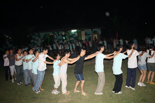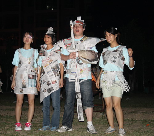 在所有活動(dòng)結(jié)束之后教練宣布了今天一天活動(dòng)的累計(jì)成績,我們雷隊(duì)以七十多分的總分拿到了第一名,大家歡呼雀躍著,心頭也不禁冒出了身為團(tuán)隊(duì)成員的自豪感。隨后教練分發(fā)給每組一疊報(bào)紙、一把剪刀和一卷膠帶,宣布了晚上篝火晚會(huì)的重頭活動(dòng)是“環(huán)保服裝秀”,同時(shí)名列后兩名的十八羅漢隊(duì)和野狼隊(duì)還必須再各出一個(gè)節(jié)目。我們雷隊(duì)沒有準(zhǔn)備節(jié)目的壓力,所以大家都顯得相當(dāng)輕松,吃完飯后一起去了福娃的宿舍,大家商量著要用報(bào)紙裁剪出什么樣的服裝,不過時(shí)間不多,我們大家又都不是特別手巧的人,既然有福娃和NONO這兩大猛男做模特,服裝不做的熱辣刺激一些那就真是對(duì)不起觀眾了。定下了服裝的風(fēng)格,我們幾個(gè)女孩子三下五除二,就剪出兩件火辣辣的草裙,既然是“猛男+草裙”,那我們隊(duì)節(jié)目的名稱就叫做“夏威夷風(fēng)情秀”了。
