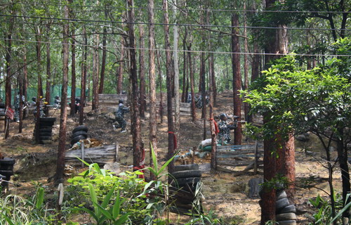 一天活動(dòng)結(jié)束后回到酒店感覺累得很,身上的衣服都是干了濕、濕了又干不知道多少遍了,沖完涼后一頭扎在舒服的床上,以為自己會(huì)很暢快地大睡一覺,誰知道一夜反反復(fù)復(fù)地醒了好幾次,半夜里響起好大的雷聲,轟隆隆地打的嚇人,好不容易熬到天亮,去餐廳吃了早餐辦理了退房手續(xù)就直接集合了。半夜下的雨讓外面的草地濕漉漉的,溫度比昨天下降了不少,在進(jìn)行了幾個(gè)熱身的小游戲之后我們就直奔今天第一個(gè)活動(dòng)的地點(diǎn)――玄真野戰(zhàn)基地。對(duì)了,忘記說我們今天的第一個(gè)活動(dòng)是打野戰(zhàn)。我從小就崇拜軍人,想到自己也能穿上迷彩服端著槍在叢林里沖鋒陷陣,心情不由地興奮萬分。到了野戰(zhàn)基地遠(yuǎn)遠(yuǎn)就聽到山上有“啪啪”的槍聲,大家的情緒明顯高昂了起來。教練讓我們分成了藍(lán)、綠兩方,藍(lán)方負(fù)責(zé)守,綠方負(fù)責(zé)攻,我被分到了藍(lán)方。分好后分別去挑選衣服,藍(lán)、綠兩種衣服被亂糟糟地堆在一起,房頂上還掛了不少,不知道是洗了沒干,還是根本就是穿過后汗水濕透了沒洗,所有的衣服都是濕漉漉的,我隨便在里面挑了一套看也沒看就穿上了。集合的時(shí)候野戰(zhàn)教練問的第一個(gè)問題就是:有哪些人把褲子穿反了,我仔細(xì)看了下自己穿的褲子,果然把褲袋穿到后面去了,看看周圍倒真是有不少人都犯了這個(gè)錯(cuò)誤,看來我們離軍人的要求還真差的不是一般的遠(yuǎn),嘿嘿,反正上裝肥大得很,將褲子都籠住了半截,我們也就懶得去糾正這個(gè)錯(cuò)誤了。