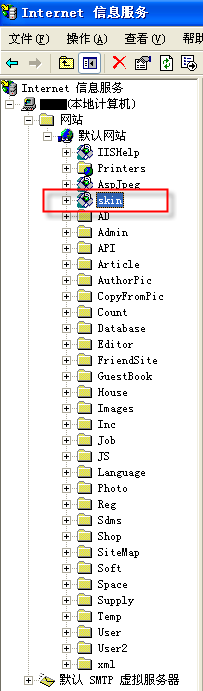 再一想,所有鏈接地址什么的都正確,只有圖片不顯示,會不會是找不到Skin這個目錄?或是打開他的Internet 信息服務(wù),查看網(wǎng)站中的設(shè)置,發(fā)現(xiàn)了默認網(wǎng)站中多了個“Skin”虛擬目錄(下圖所示),這就是罪魁禍首:訪問時系統(tǒng)因為存在了同名的虛擬目錄,即訪問時當作訪問虛擬目錄的方式進行,與網(wǎng)站的Skin目錄相沖突了。刪除了這個“Skin”虛擬目錄后,一切恢復(fù)正常。