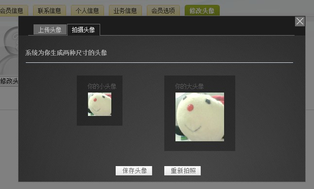 下面我們來(lái)看看有趣的頭像應(yīng)用,可以直接在會(huì)員中心首頁(yè)點(diǎn)擊頭像進(jìn)入修改頁(yè)面,或者在左側(cè)的“修改個(gè)人信息”來(lái)實(shí)現(xiàn)。更改頭像有兩種方式,您可以直接上傳頭像,或者使用在線拍攝頭像功能。拍攝完畢后還會(huì)出現(xiàn)圖片剪裁框,根據(jù)取景效果和拍攝質(zhì)量,可以自由調(diào)整畫(huà)面尺寸,使得頭像更加“精神”、展示自己的獨(dú)特風(fēng)范。當(dāng)然,如果感覺(jué)此次拍攝的質(zhì)量一般,還可選擇“重新拍照”。