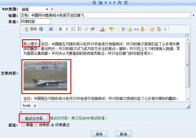 然而,在經(jīng)過簡單的設(shè)置后,只需一個(gè)按鈕即可很好的解決這兩個(gè)問題。在下圖中可以看到,在“RSS/WAP參數(shù)配置”里設(shè)好生成WAP圖片的參數(shù)后,點(diǎn)擊“格式化內(nèi)容”按鈕,圖片即會與文字格式一起發(fā)生變化。