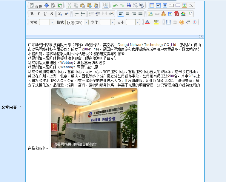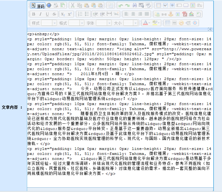 在動易后臺,進入“添加文章頁面”,在編輯器中輸入文字,添加圖片后,此時文章無格式: