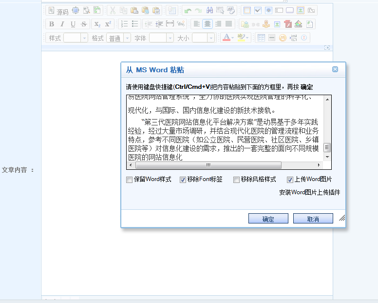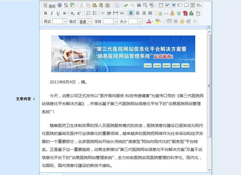 在動易后臺,進入“添加文章頁面”,在編輯器中從MS Word粘貼剛復(fù)制的文章:
