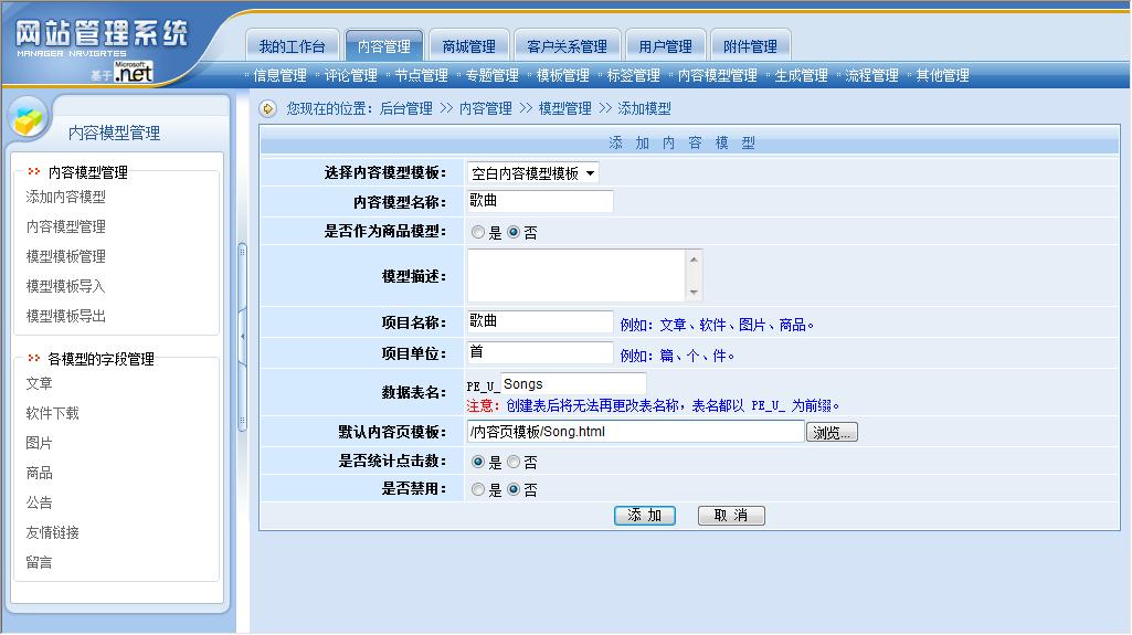 內(nèi)容模型就是將系統(tǒng)原來的“文章”、“下載”、“圖片”、“商品”、“公告”、“友情鏈接”、“留言”、“供求信息”、“房產(chǎn)信息”等功能模塊統(tǒng)一抽象為“內(nèi)容模型”,所有模型的所有字段都可以由站長進(jìn)行控制。動易CMS 2007版系統(tǒng)會內(nèi)置“文章”、“下載”、“圖片”、“商品”、“公告”、“友情鏈接”、“留言”、“供求信息”、“房產(chǎn)信息”等常用內(nèi)容模型(可能會根據(jù)版本不同而有所區(qū)別)以方便用戶直接使用。站長也可以根據(jù)需要,隨時添加新的內(nèi)容模型,如:可以添加Flash模型、影視模型、音樂模型、課件模型、教案模型……等等,需要什么內(nèi)容模型就可以添加和創(chuàng)建什么內(nèi)容模型。當(dāng)然,站長也可以隨時修改、刪除或禁用系統(tǒng)已有的內(nèi)容模型。對于內(nèi)置的內(nèi)容模型,站長也可以對模型的字段進(jìn)行管理(包括添加、刪除、修改、排序等管理操作)。