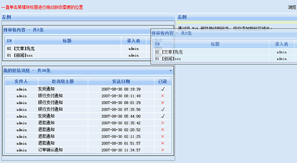 3、整個“我的工作臺”首頁采用了流行的拖拽效果和ajax效果處理,通過拖拽、移動可以對頁面的內(nèi)容與布局進(jìn)行編輯。