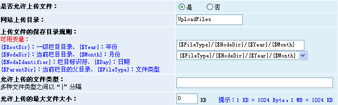 從圖中可以看出,除了上傳文件管理能夠?qū)Ρ4娴奈募M行分類外,還能夠控制上傳功能開關(guān)、上傳文件類型和文件大小。另外,上傳文件管理功能配合系統(tǒng)內(nèi)置的上傳文件過濾功能,可謂是對上傳了進行了全方位的管理了。
