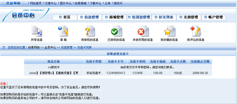 好了,以上步驟全部完成后,充值卡就可以在前臺(tái)商城中出售了,客戶可以像購買其他商品一樣購買充值卡,而且動(dòng)易eShop2007還具備自動(dòng)交付充值卡的功能??蛻粼谥Ц锻戤呚浛詈?,管理員在后臺(tái)訂單管理頁面可以直接點(diǎn)擊“交付充值卡”來發(fā)貨,隨后客戶即可在前臺(tái)會(huì)員中心里直接提取到充值卡卡號(hào)和密碼。