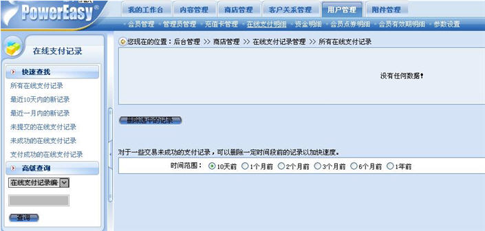 該功能可以讓商家清楚地了解店鋪發(fā)生的每一筆顧客購(gòu)買商品進(jìn)行在線支付的情況,當(dāng)商家要進(jìn)行顧客支付確認(rèn)的時(shí)候,該功能允許商家根據(jù)支付時(shí)間、用戶名或在線支付編號(hào)進(jìn)行交易支付記錄的快速檢索。此外,動(dòng)易eShop2007也內(nèi)置了一些常用的條件查詢功能菜單,如查詢“所有的記錄”、“最近10天的記錄”、“最近一個(gè)月的記錄”、“未提交的在線支付記錄”、“未成功的在線支付記錄”等,以方便商家快速了解網(wǎng)店顧客購(gòu)買商品的支付情況,更高效地進(jìn)行網(wǎng)店的收款管理。