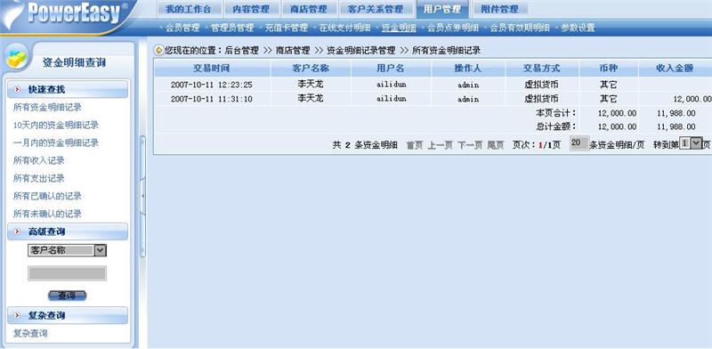 在網(wǎng)店中,在線的支付方式是最為普遍的支付方式,大多顧客都會(huì)選擇和使用此種方式來(lái)支付,于是在動(dòng)易eShop2007用戶管理模塊中單獨(dú)設(shè)定了“在線支付明細(xì)”功能。