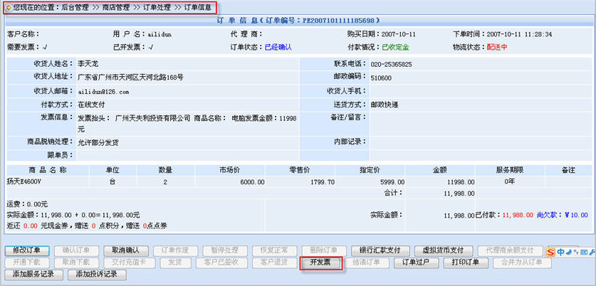 在動(dòng)易eShop2007里,為顧客開發(fā)票是通過(guò)這個(gè)步驟進(jìn)行的:后臺(tái)管理——商店管理——訂單處理——訂單信息——開發(fā)票。