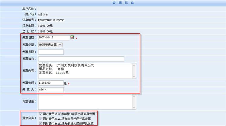 點(diǎn)擊開發(fā)票按鈕后,商家進(jìn)入開發(fā)票表單填寫開票信息。在這里,系統(tǒng)還提供了開具發(fā)票的短信通知功能。已添加的開票信息會(huì)在對(duì)應(yīng)的訂單信息中顯示出來(lái)