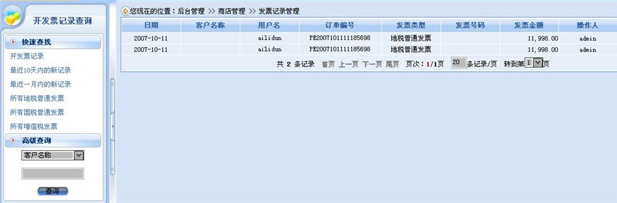 系統(tǒng)提供了快速查找功能,預(yù)置了一些常用查詢。除了可以通過(guò)時(shí)間進(jìn)行查詢之外,還可以對(duì)開票的類型進(jìn)行查詢,另外,在高級(jí)查詢功能中,商家可以指定“客戶名稱”、“開票人”選、“開票日期”,來(lái)進(jìn)行查詢,而不用從訂單中來(lái)查看開票的信息,極大的提高財(cái)務(wù)發(fā)票管理的效率。