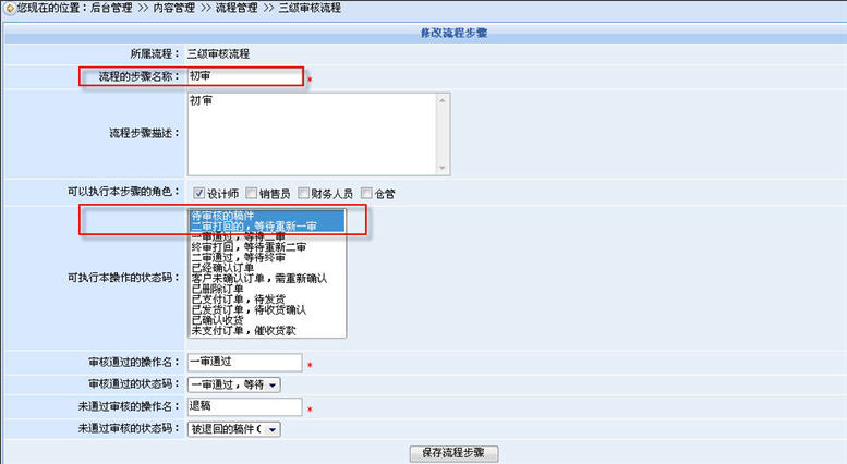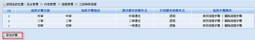在添加步驟的頁面里,我們根據(jù)所設計的三級審核流程來指定該步驟的各種參數(shù),如:步驟名稱、可執(zhí)行本步驟的角色、哪種狀態(tài)的稿件可以執(zhí)行本步驟的操作、通過(不通過)該步驟的操作的命名、通過(不通過)該步驟的稿件狀態(tài)等。