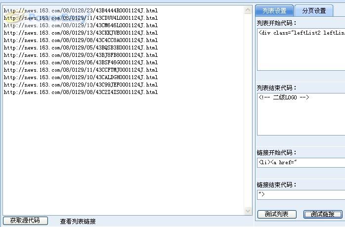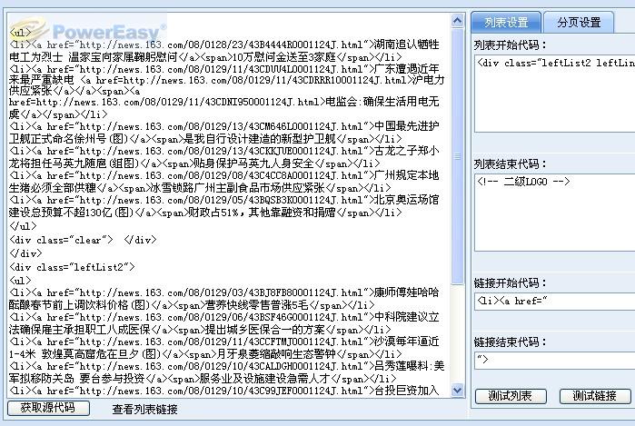 這里說(shuō)的即時(shí)顯示指的是無(wú)刷新即看見(jiàn)采集的效果,所有的采集規(guī)則都可以通過(guò)AJAX效果進(jìn)行預(yù)覽。比如我們采集 的國(guó)內(nèi)新聞列表,當(dāng)我們?cè)O(shè)置好列表采集規(guī)則后,點(diǎn)擊“測(cè)試列表”和“測(cè)試鏈接”我們就可以直接在左邊預(yù)覽到采集后的效果(如下圖)。